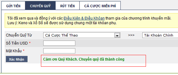 Chuyển quỹ từ: Cái này bạn sẽ chọn từ 1 quỹ bạn có tiền chuyển về Tài khoản chính. Nếu bạn chơi cá cược bóng đá thì chuyển quỹ từ Cá cược thể thao về Tài khoản chính. Tiếp theo bạn đánh số tiền muốn rút vào, đánh mật khẩu vào rồi nhấn “Xác nhận”